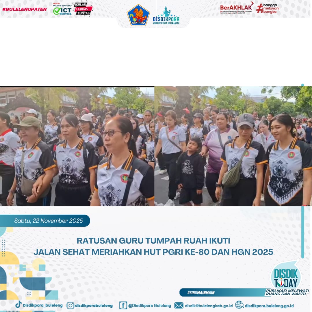 Ratusan guru dari berbagai penjuru Kabupaten Buleleng tumpah ruah memadati Lapangan Taman Kota Singaraja, Sabtu (21/11/2025). Kehadiran mereka adalah untuk mengikuti kegiatan Jalan Sehat yang diselenggarakan dalam rangka memperingati Hari Ulang Tahun (HUT) Persatuan Guru Republik Indonesia (PGRI) Ke-80 dan Hari Guru Nasional (HGN) tahun 2025.