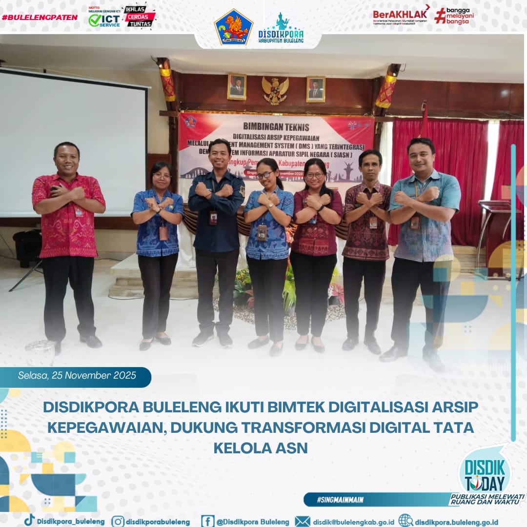 Dalam upaya mengakselerasi transformasi digital di lingkungan Pemerintah Kabupaten Buleleng, sejumlah staf dari Dinas Pendidikan Pemuda dan Olahraga (Disdikpora) Buleleng mengikuti Bimbingan Teknis (Bimtek) Digitalisasi Arsip Kepegawaian. Kegiatan ini bertujuan untuk meningkatkan efisiensi dan akuntabilitas pengelolaan data Aparatur Sipil Negara (ASN).