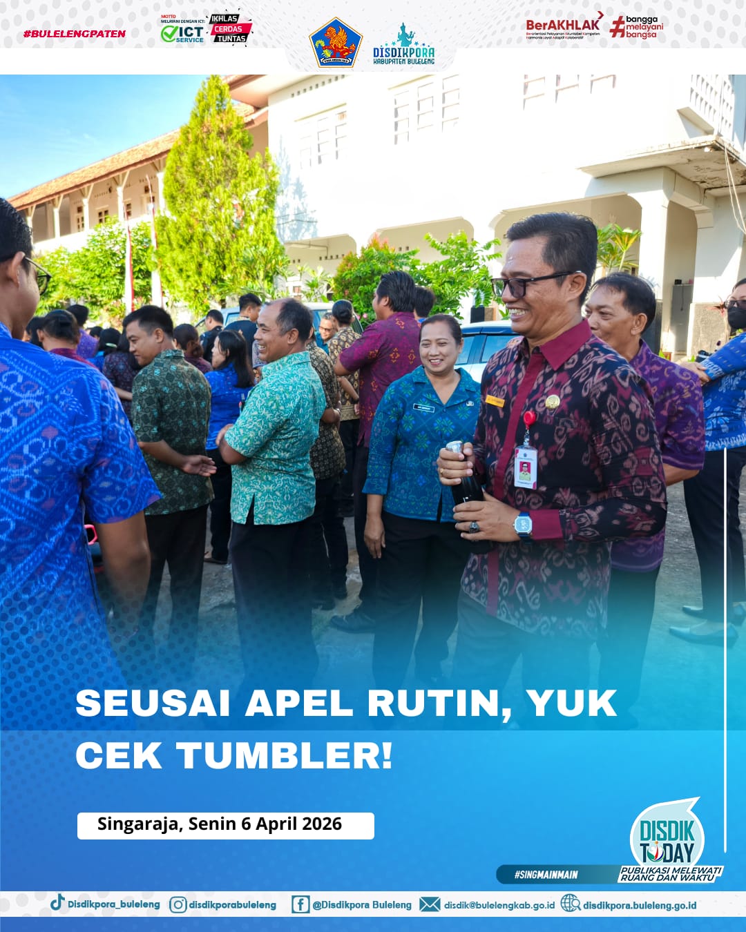Singaraja, Selasa 7 April 2026 | Disdiktoday Komitmen Pemerintah Kabupaten Buleleng dalam mengurangi penggunaan plastik sekali pakai terus diperkuat di lingkungan Dinas Pendidikan Pemuda dan Olahraga (Disdikpora). Hal ini terlihat usai pelaksanaan apel rutin pagi ini, di mana Kepala Disdikpora Kabupaten Buleleng, Ida Bagus Gde Surya Bharata, S.Pd., M.A.P., mengecek tumbler yang dibawa seluruh Karyawan dan karyawati.
