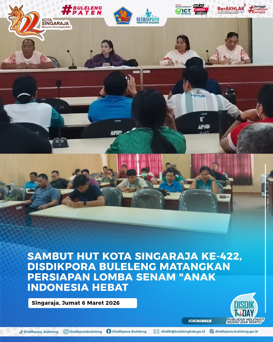 Menjelang perayaan Hari Ulang Tahun (HUT) Kota Singaraja ke-422, Dinas Pendidikan Pemuda dan Olahraga (Disdikpora) Kabupaten Buleleng mulai mematangkan persiapan berbagai perlombaan. Pada Jumat (6/3/2026), bertempat di Aula Disdikpora, telah dilaksanakan Technical Meeting untuk kegiatan Lomba Senam "Anak Indonesia Hebat" tingkat SMP.