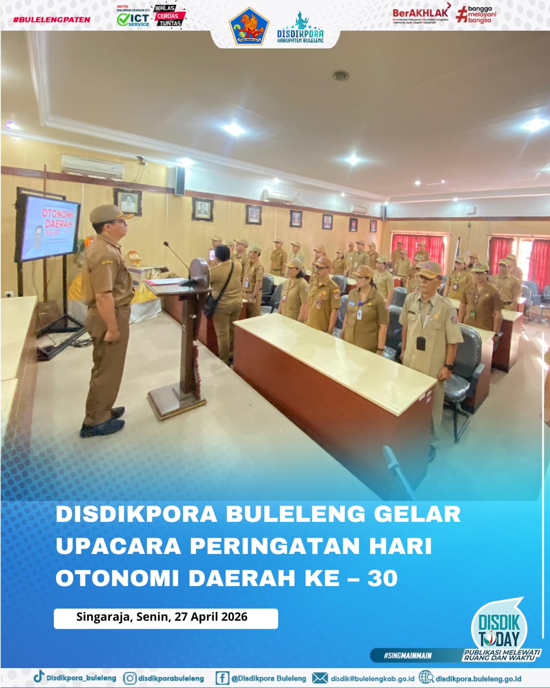 Perlu diketahui bersama bahwa Upacara Peringatan Hari Otonomi Daerah ke-30 yang sedianya dijadwalkan berlangsung di halaman kantor, dialihkan ke Aula Kantor Dinas dikarenakan faktor cuaca. Meskipun demikian, prosesi upacara tetap berjalan dengan khidmat dan lancar dengan diikuti oleh seluruh jajaran Disdikpora Kabupaten Buleleng
