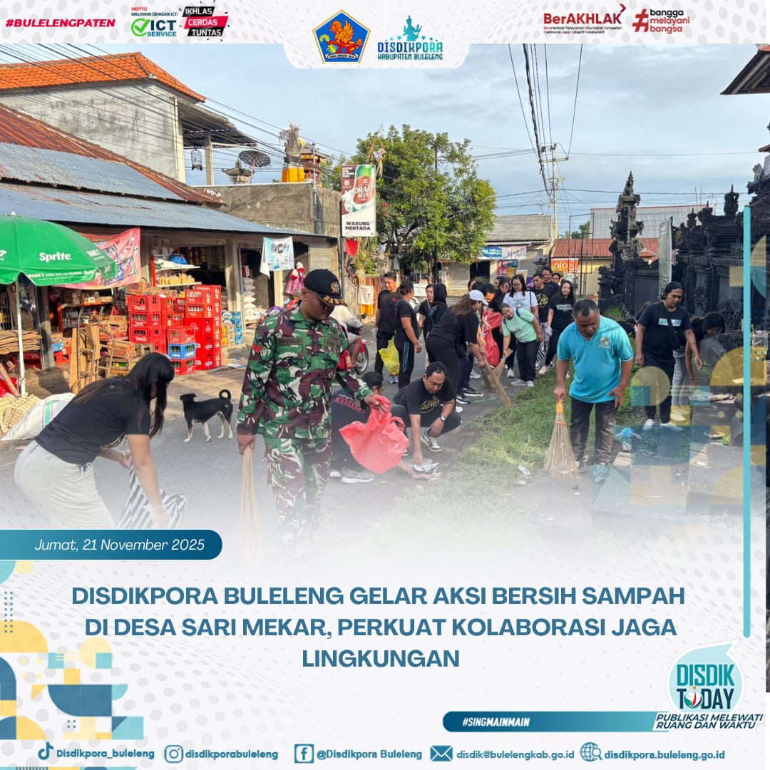 Sejumlah pejabat dan pegawai dari Dinas Pendidikan Pemuda dan Olahraga (Disdikpora) Kabupaten Buleleng kembali menunjukkan komitmen nyata mereka terhadap kebersihan lingkungan. Untuk ketiga kalinya, Disdikpora Buleleng menggelar aksi sosial bertajuk Gerakan Buleleng Bersih Sampah yang kali ini dilaksanakan di Desa Sari Mekar, Kecamatan Buleleng, pada hari Jumat (21/11).