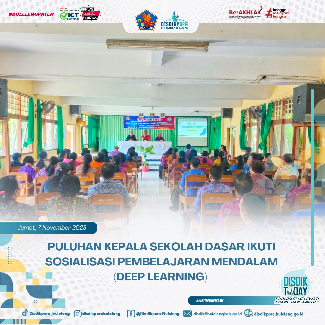 Puluhan Kepala Sekolah Dasar (SD) se-Kecamatan Buleleng antusias mengikuti kegiatan Sosialisasi Pendekatan Pembelajaran Mendalam (Deep Learning) yang diselenggarakan di Aula Korwil Disdikpora Kecamatan Buleleng.