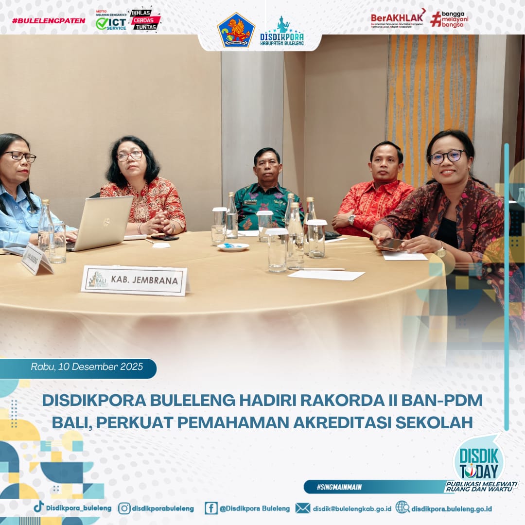 Dinas Pendidikan Pemuda dan Olahraga (Disdikpora) Kabupaten Buleleng turut berpartisipasi aktif dalam Rapat Koordinasi Daerah (RAKORDA II) yang diselenggarakan oleh Badan Akreditasi Nasional Pendidikan Anak Usia Dini, Pendidikan Dasar, dan Pendidikan Menengah (BAN-PDM) Provinsi Bali.
