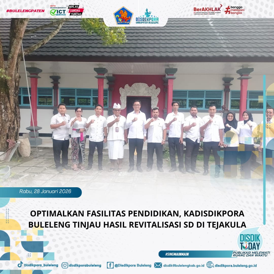 Komitmen Pemerintah Kabupaten Buleleng dalam meningkatkan kualitas sarana dan prasarana pendidikan terus diwujudkan. Pada Rabu (28/1), Kepala Dinas Pendidikan Pemuda dan Olahraga (Disdikpora) Kabupaten Buleleng, Ida Bagus Gde Surya Bharata, S.Pd., M.A.P., melaksanakan kunjungan kerja di Kecamatan Tejakula guna meninjau langsung hasil program revitalisasi sekolah dasar tahun anggaran 2025.