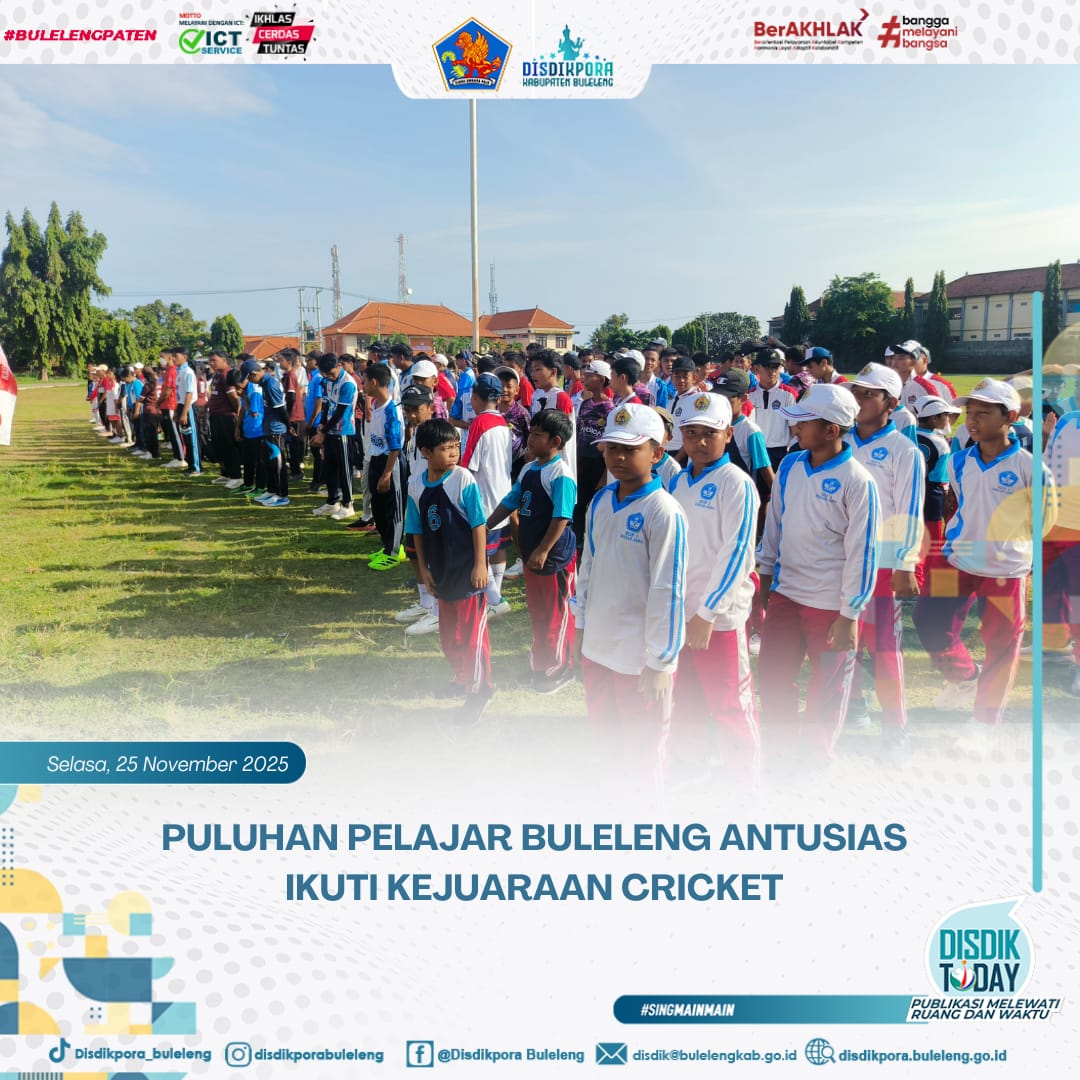 Suasana meriah dan penuh semangat menyelimuti Lapangan GOR Bhuana Patra Singaraja pada Selasa, (25/11). Puluhan siswa-siswi dari jenjang SD, SMP, dan SMA/SMK se-Kabupaten Buleleng menunjukkan antusiasme yang tinggi saat mengikuti acara pembukaan Kejuaraan Cricket Antar Pelajar Se-Kabupaten Buleleng tahun 2025.