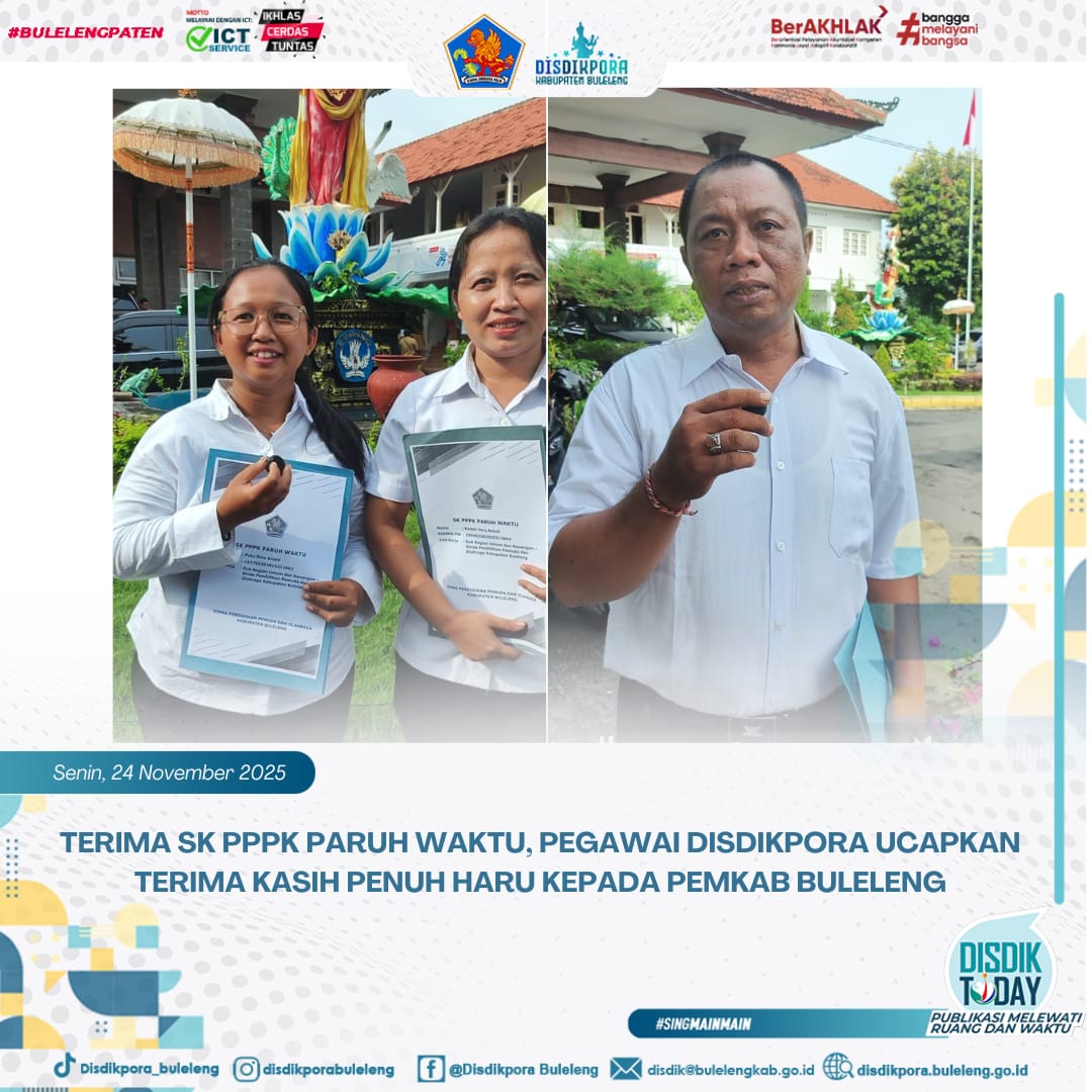 Suasana haru dan bahagia mewarnai momen penyerahan Surat Keputusan (SK) Pegawai Pemerintah dengan Perjanjian Kerja (PPPK) Paruh Waktu di lingkup Dinas Pendidikan Pemuda dan Olahraga (Disdikpora) Kabupaten Buleleng. Penantian panjang para tenaga kontrak akhirnya berbuah manis setelah mereka resmi diangkat menjadi bagian dari Aparatur Sipil Negara (ASN) oleh Pemerintah Kabupaten Buleleng pada tahun 2025.