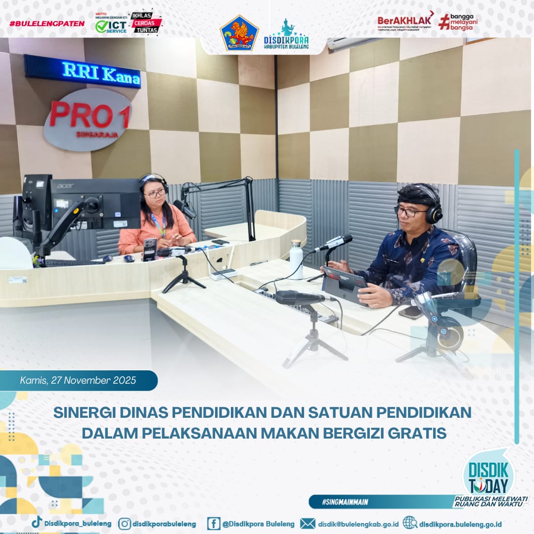 Hal ini disampaikan oleh Kadisdikpora Buleleng saat menjadi narasumber utama dalam Dialog Interaktif "Hai Bali Ken - Ken" yang disiarkan langsung oleh RRI Singaraja pada Kamis (27/11), dengan topik "Sinergi Dinas Pendidikan dan Satuan Pendidikan Dalam Pelaksanaan MBG".