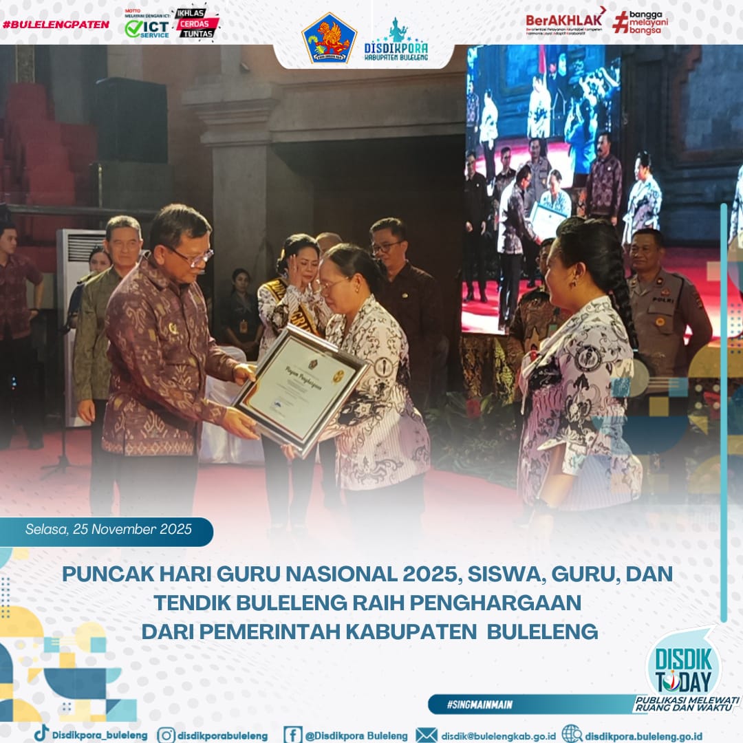 Puncak peringatan Hari Guru Nasional 2025 di Kabupaten Buleleng juga dirangkaikan ini dengan penyerahan penghargaan bergengsi kepada sejumlah siswa berprestasi, Guru, dan Tenaga Kependidikan (GTK) atas dedikasi serta kontribusi luar biasa mereka dalam dunia pendidikan di Bumi Panji Sakti.