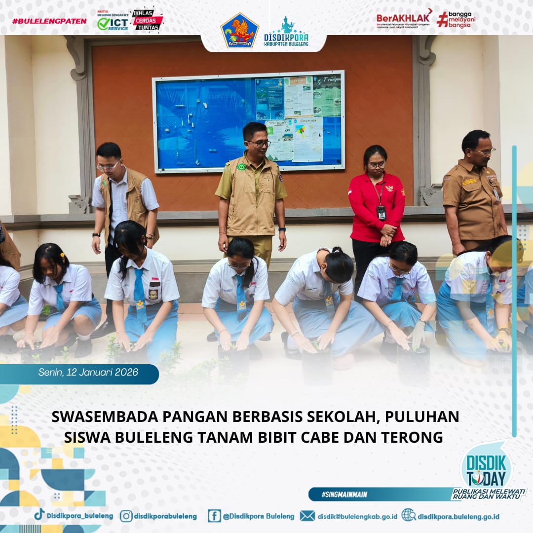 Pemerintah Kabupaten Buleleng terus berkomitmen memperkuat ketahanan pangan daerah melalui sektor pendidikan. Hal ini dibuktikan dengan kehadiran Kepala Dinas Pendidikan Pemuda dan Olahraga (Disdikpora) Kabupaten Buleleng, Ida Bagus Gde Surya Bharata, S.Pd., M.A.P., mendampingi Sekretaris Daerah Kabupaten Buleleng, Drs. Gede Suyasa, M.Pd., dalam kegiatan Program Ketahanan Pangan Berbasis Sekolah pada Senin (12/1/2026).