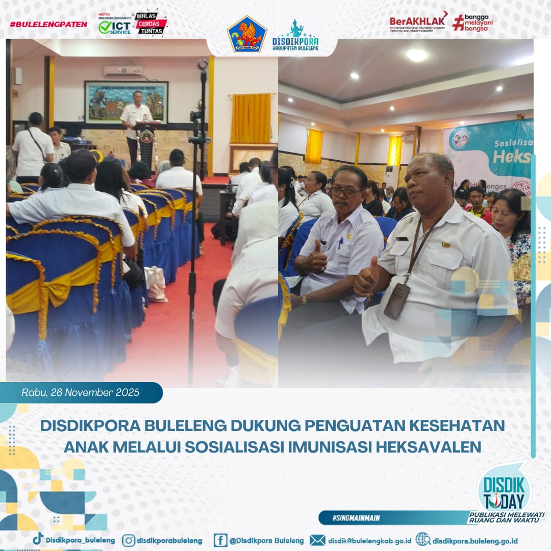 Dinas Pendidikan Pemuda dan Olahraga (Disdikpora) Kabupaten Buleleng turut serta aktif dalam upaya penguatan kesehatan masyarakat, khususnya anak-anak, dengan menghadiri Sosialisasi Imunisasi Heksavalen. Kegiatan penting ini diselenggarakan pada hari Rabu, 26 November 2025, di Stikes Kampus, Bungkulan, Buleleng.