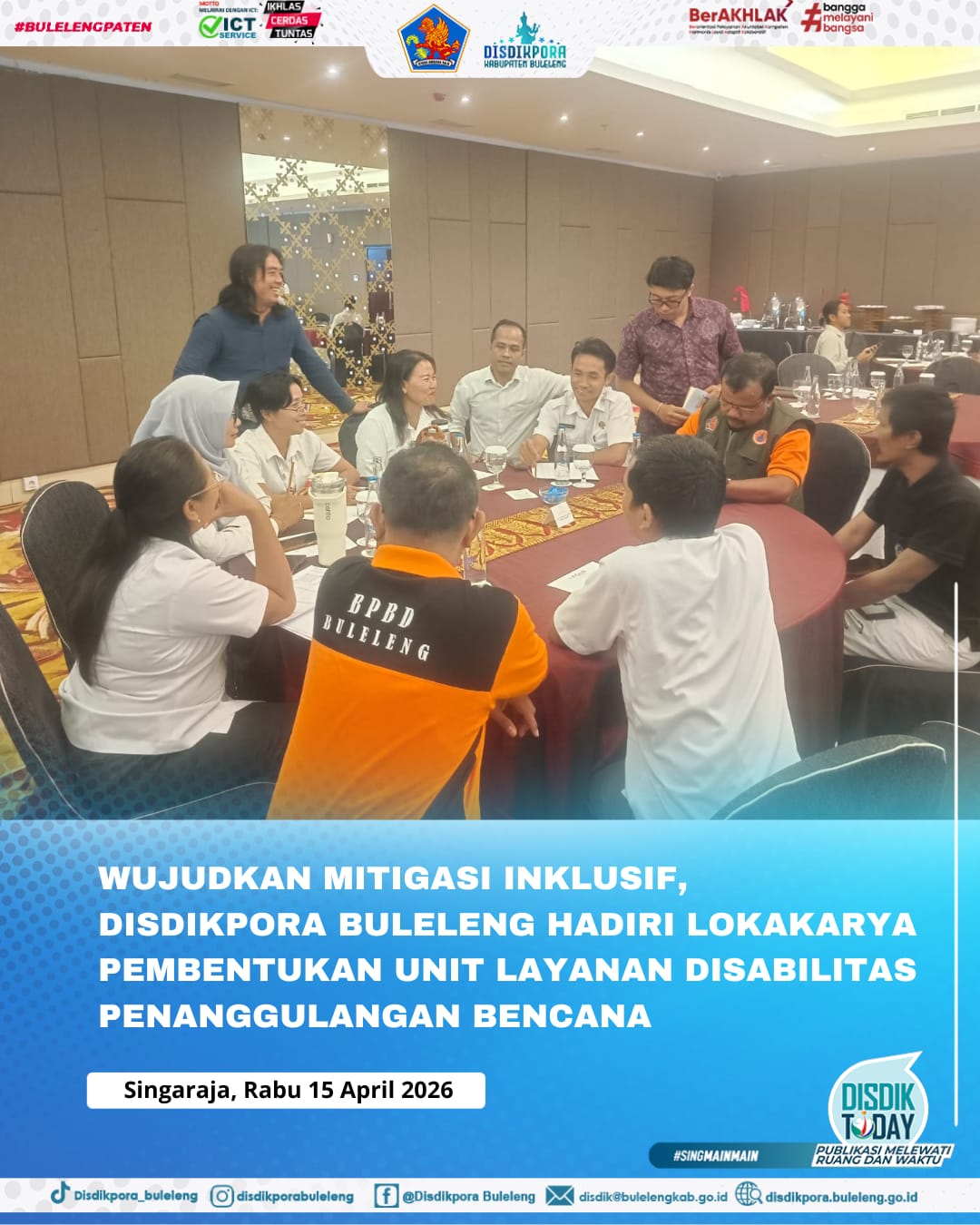 Dinas Pendidikan Pemuda dan Olahraga (Disdikpora) Kabupaten Buleleng berkomitmen mendukung terciptanya sistem penanggulangan bencana yang ramah terhadap penyandang disabilitas. Dukungan ini ditegaskan dalam acara Lokakarya Forum Konsultasi Rencana Pembentukan Unit Layanan Disabilitas Penanggulangan Bencana (ULD PB) bagi Kabupaten Buleleng dan Kabupaten Karangasem, yang berlangsung di Four Star by Trans Hotel, Renon, Denpasar, Rabu (15/4).