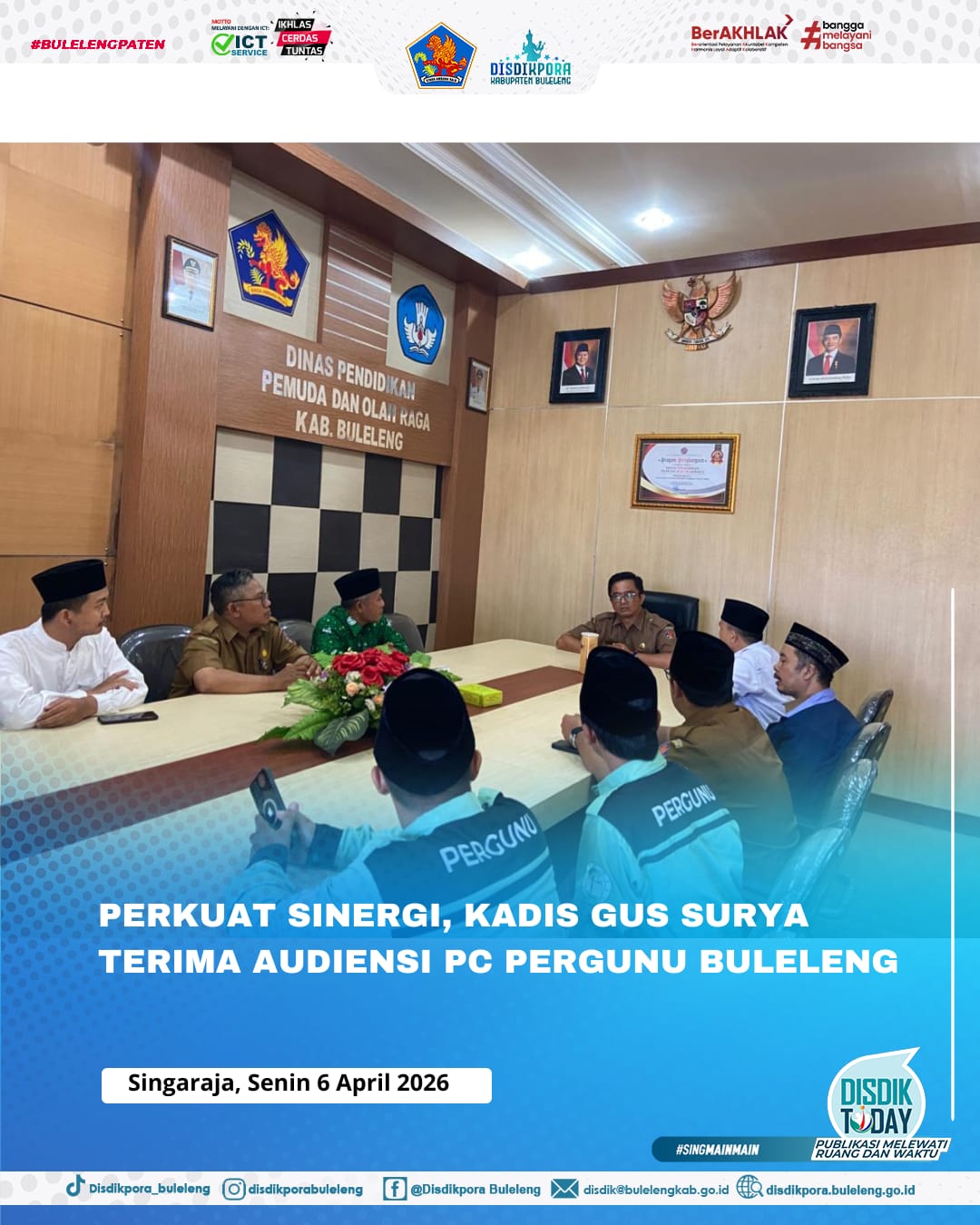 Kepala Dinas Pendidikan Pemuda dan Olahraga (Disdikpora) Kabupaten Buleleng, Ida Bagus Gde Surya Bharata, S.Pd., M.A.P., menerima audiensi dari jajaran Pimpinan Cabang Persatuan Guru Nahdlatul Ulama (PC PERGUNU) Kabupaten Buleleng masa bakti 2022-2027. Pertemuan yang berlangsung hangat tersebut dilaksanakan di Ruang Rapat Kepala Dinas pada Senin (6/4).