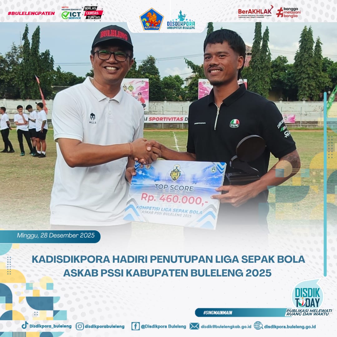 Kepala Dinas Pendidikan Pemuda dan Olahraga Kabupaten Buleleng ida Bagus Gde Surya Bharata, S. Pd., M. A. P., menghadiri sekaligus menyaksikan pertandingan diakhir penutup Liga Askab PSSI Buleleng tahun 2025 di Stadion Mayor Metra Singaraja, Minggu, (28/12)