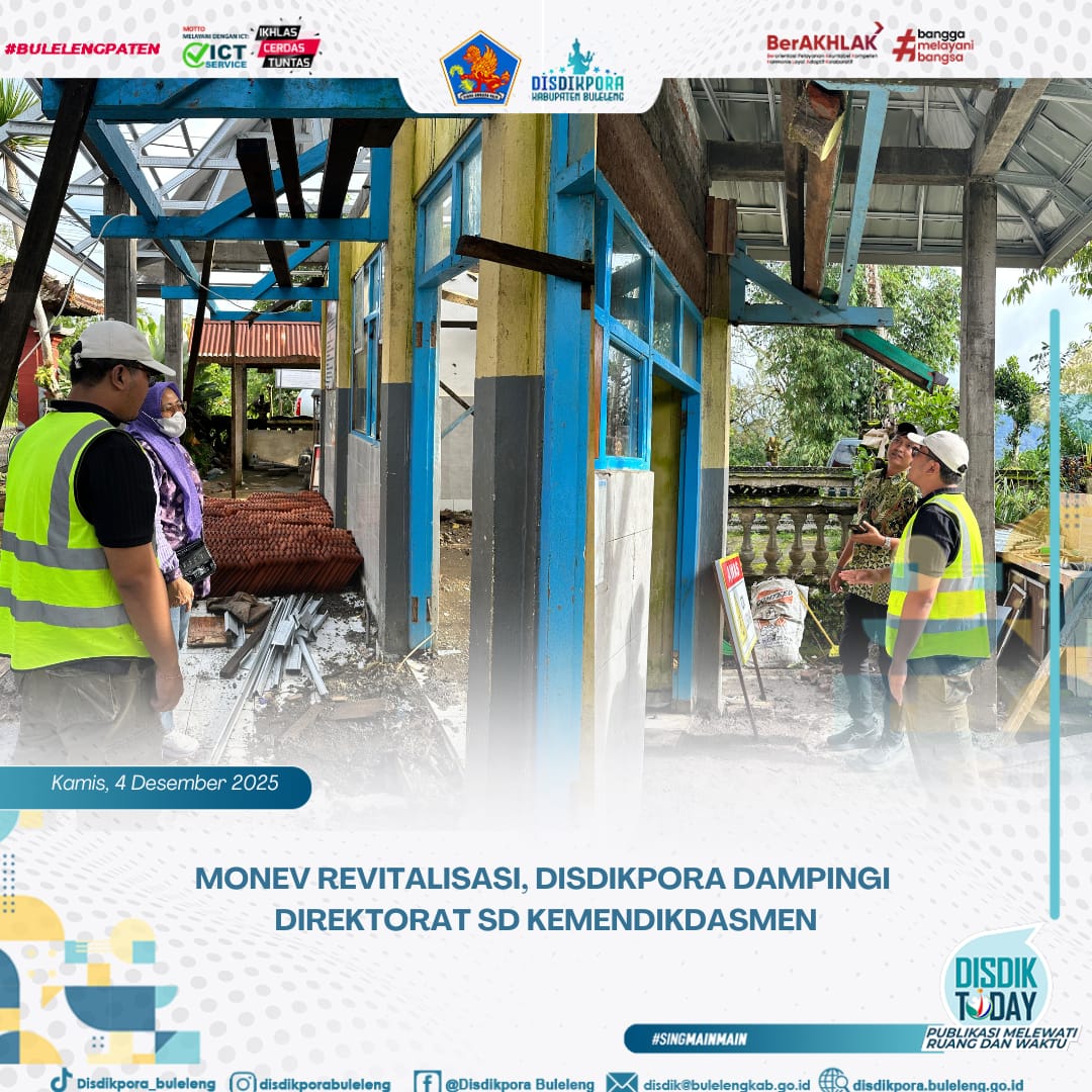 Dinas Pendidikan, Pemuda, dan Olahraga (Disdikpora) Kabupaten Buleleng melalui Seksi Kelembagaan dan Sarana Prasarana (Sarpras) SD melaksanakan pendampingan intensif terkait program Revitalisasi Sekolah Dasar Tahun 2025. Pendampingan ini merupakan bagian dari kegiatan Monitoring dan Evaluasi (Monev) Revitalisasi Sekolah Dasar di Kabupaten Buleleng yang dilakukan langsung oleh Tim Monev dari Direktorat Sekolah Dasar, Kementerian Pendidikan Dasar dan Menengah.