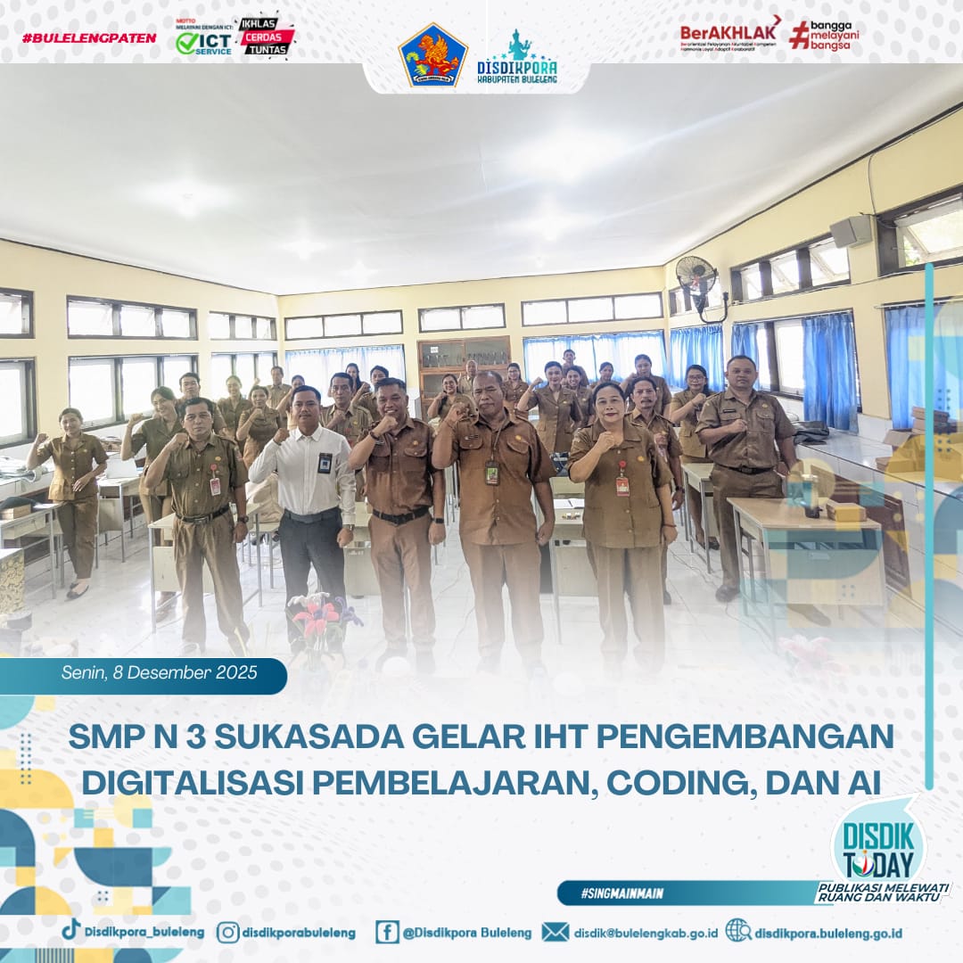 SMP Negeri 3 Sukasada mengambil langkah proaktif dalam meningkatkan mutu pendidikan dengan menyelenggarakan kegiatan In House Training (IHT) Pengembangan Digitalisasi Pembelajaran Mendalam, Coding, dan Kecerdasan Artifisial (AI). Acara ini resmi dibuka pada hari Senin (8/12) dan akan berlangsung selama empat hari, hingga Kamis, 11 Desember 2025.