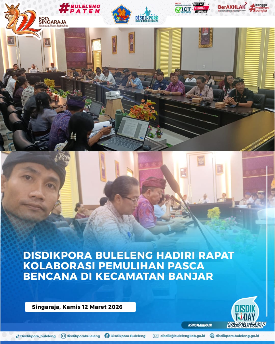 Dinas Pendidikan Pemuda dan Olahraga (Disdikpora) Kabupaten Buleleng, diwakili oleh Sekretaris Dinas, Luh Putu Adi Ariwati, SE., M.Pd., mengikuti Rapat Kolaborasi Upaya Pemulihan Pasca Bencana di Kecamatan Banjar. Rapat tersebut berlangsung di Ruang Rapat Bappeda Kabupaten Buleleng pada Kamis (12/3).