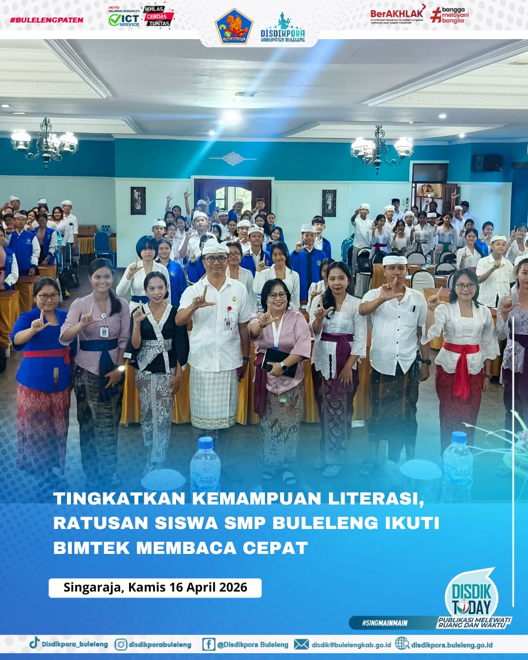 Dinas Pendidikan Pemuda dan Olahraga (Disdikpora) Kabupaten Buleleng terus berkomitmen memperkuat kualitas literasi peserta didik di Kabupaten Buleleng. Hal ini diwujudkan melalui acara bimbingan teknis (Bimtek) bertajuk "Peserta Didik Terbina Program Literasi: Peningkatan Kompetensi Membaca Cepat bagi Siswa SMP di Kabupaten Buleleng", yang berlangsung di Hotel Bali Taman, Singaraja, Kamis (16/4).