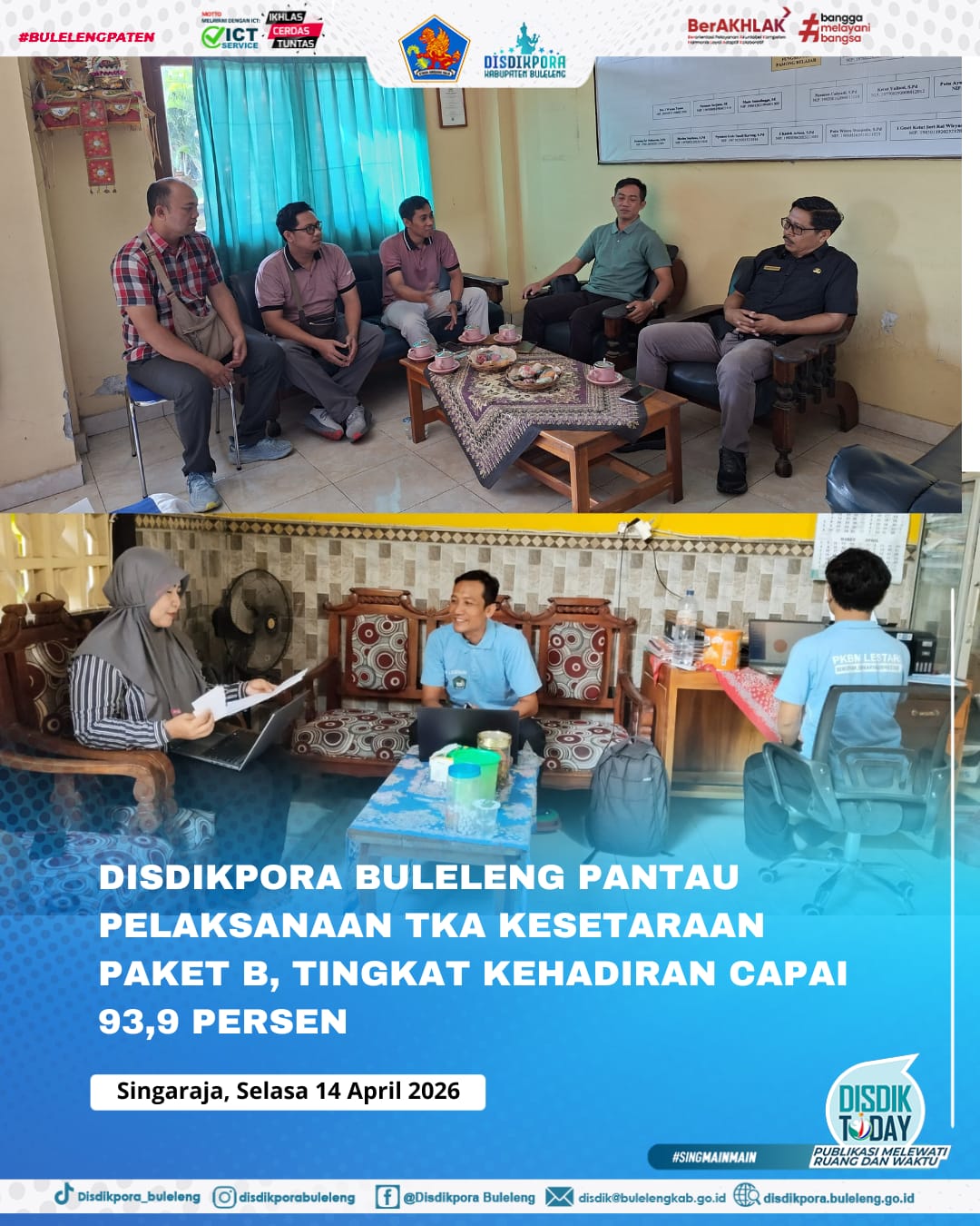 Dinas Pendidikan Pemuda dan Olahraga (Disdikpora) Kabupaten Buleleng melakukan monitoring dan evaluasi (Monev) intensif terhadap pelaksanaan Tes Kompetensi Akademik (TKA) Pendidikan Kesetaraan Paket B. Kegiatan yang berlangsung pada Senin, 13 April 2026 ini menyasar sejumlah titik lokasi ujian di wilayah Kabupaten Buleleng.