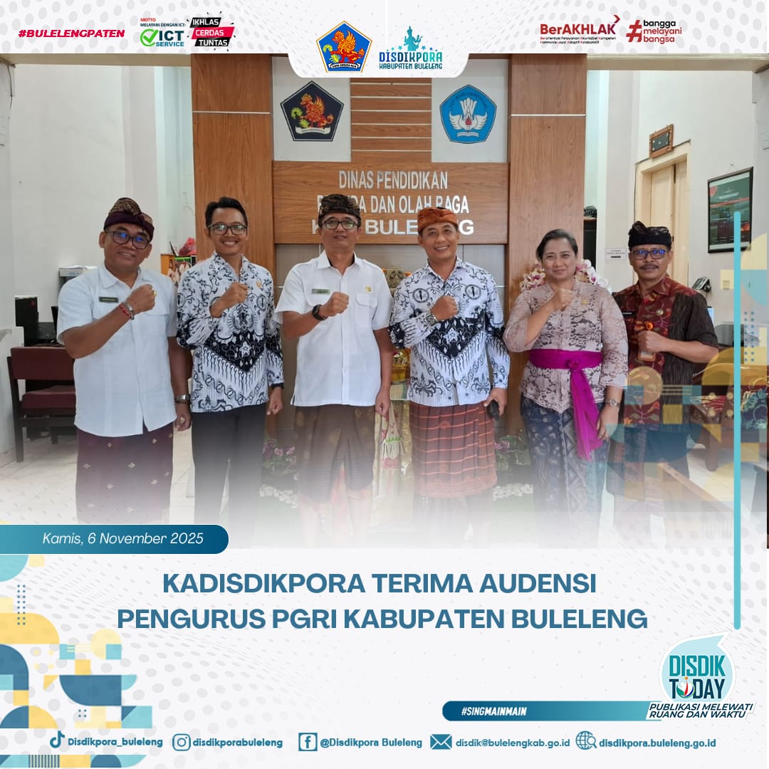 Kepala Dinas Pendidikan Pemuda dan Olahraga (Disdikpora) Kabupaten Buleleng, Ida Bagus Gde Surya Bharata, S. Pd., M. A. P., menerima audiensi penting dari Pengurus Persatuan Guru Republik Indonesia (PGRI) Kabupaten Buleleng.