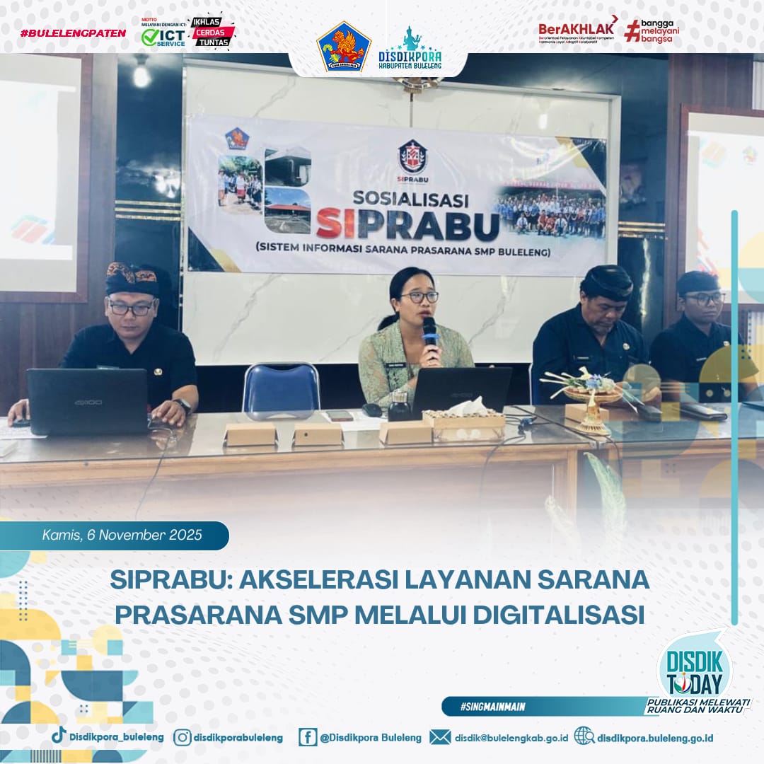 Dinas Pendidikan Pemuda dan Olahraga (Disdikpora) Kabupaten Buleleng terus mendorong terobosan digital dalam upaya peningkatan kualitas pelayanan pendidikan. Bertempat di Aula SMP Negeri 6 Singaraja, dilaksanakan Rapat Sosialisasi Sistem Informasi Sarana Prasarana SMP Buleleng (SIPRABU) yang dirangkai dengan Sosialisasi Penerimaan Bantuan Infrastruktur Fisik Pembelajaran (IFP) bagi seluruh sekolah jenjang SMP se-Kabupaten Buleleng.