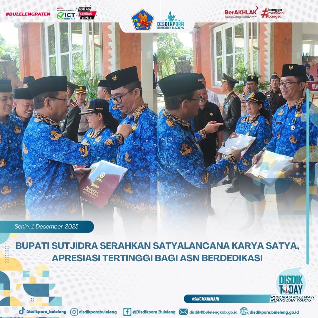 Salah satu ASN yang menerima kehormatan tersebut adalah Kepala Dinas Pendidikan Pemuda dan Olahraga (Disdikpora) Kabupaten Buleleng, Ida Bagus Gde Surya Bharata, S. Pd., M. A. P. menerima Satyalancana Karya Satya untuk pengabdian 20 tahun lebih, sebuah penanda loyalitas dan kinerja yang konsisten terhadap bangsa dan negara.