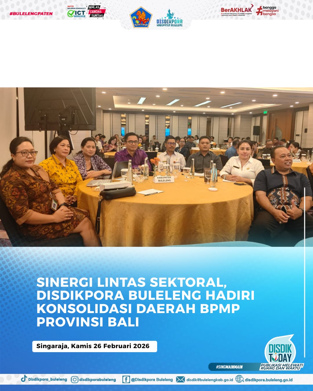 Dalam upaya memperkuat tata kelola pendidikan yang integratif, Dinas Pendidikan Pemuda dan Olahraga Kabupaten Buleleng menghadiri agenda Konsolidasi Daerah yang diselenggarakan oleh BPMP Provinsi Bali di Hotel Platinum. Kegiatan strategis ini berlangsung selama tiga hari, mulai 24 hingga 26 Februari 2026.