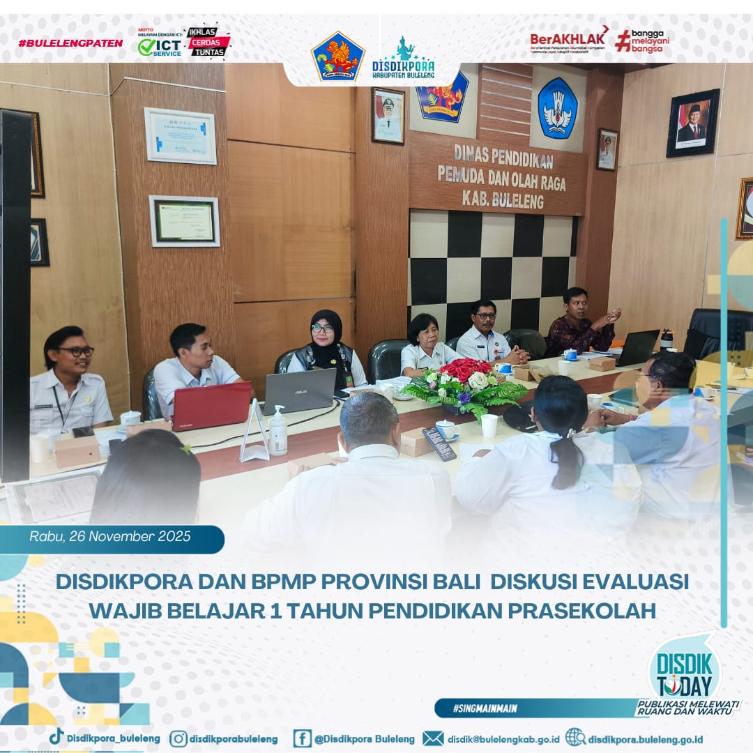 Dinas Pendidikan Pemuda dan Olahraga (Disdikpora) Kabupaten Buleleng bersama Badan Penjaminan Mutu Pendidikan (BPMP) Provinsi Bali menyelenggarakan diskusi mendalam mengenai Evaluasi Wajib Belajar 1 Tahun Pendidikan Prasekolah (Pra-Sekolah Dasar) di Kabupaten Buleleng. Kegiatan ini dilaksanakan pada hari Rabu, 26 November 2025, sebagai langkah strategis meninjau perkembangan implementasi awal dan kesiapan daerah dalam menyambut penetapan kebijakan wajib belajar prasekolah di tingkat nasional.