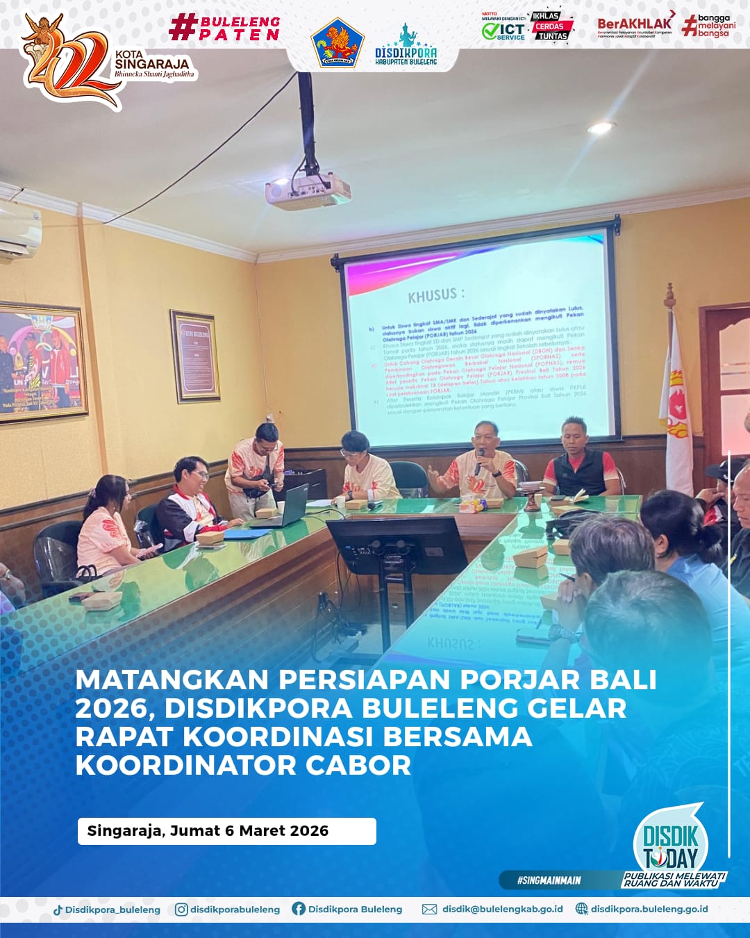 Dinas Pendidikan Pemuda dan Olahraga (Disdikpora) Kabupaten Buleleng mulai tancap gas dalam mempersiapkan kontingen menyambut Pekan Olahraga Pelajar (PORJAR) Provinsi Bali tahun 2026. Sebagai langkah awal yang strategis, Disdikpora menggelar rapat koordinasi (Rakor) penting pada Jumat (6/3/2026) bertempat di Ruang Rapat KONI Kabupaten Buleleng.