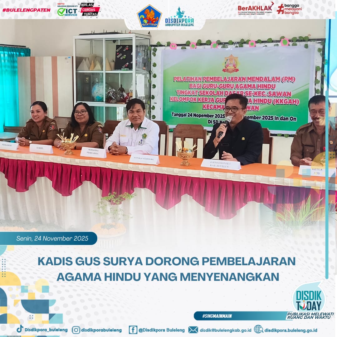 Kepala Dinas Pendidikan Pemuda dan Olahraga (Kadisdikpora) Buleleng, Ida Bagus Gde Surya Bharata, S. Pd., M. A. P., hari ini memberikan perhatian khusus pada peningkatan kualitas pendidikan agama.Ia menghadiri dan membuka secara resmi Pelatihan Pembelajaran Mendalam bagi Guru-Guru Agama Hindu Tingkat Sekolah Dasar se-Kecamatan Sawan yang diselenggarakan oleh Kelompok Kerja Agama Hindu (KKGAH) Kecamatan Sawan.