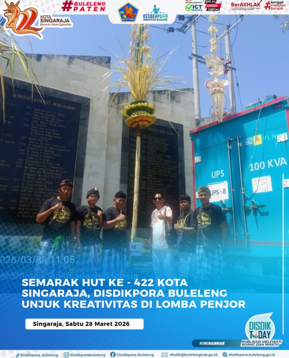 Semarak perayaan Hari Ulang Tahun (HUT) ke-422 Kota Singaraja tahun 2026 kian terasa dengan digelarnya Lomba Penjor antar Organisasi Perangkat Daerah (OPD) di lingkungan Pemerintah Kabupaten Buleleng. Dinas Pendidikan Pemuda dan Olahraga (Disdikpora) Kabupaten Buleleng turut ambil bagian dalam ajang pelestarian budaya ini, Sabtu (28/3).