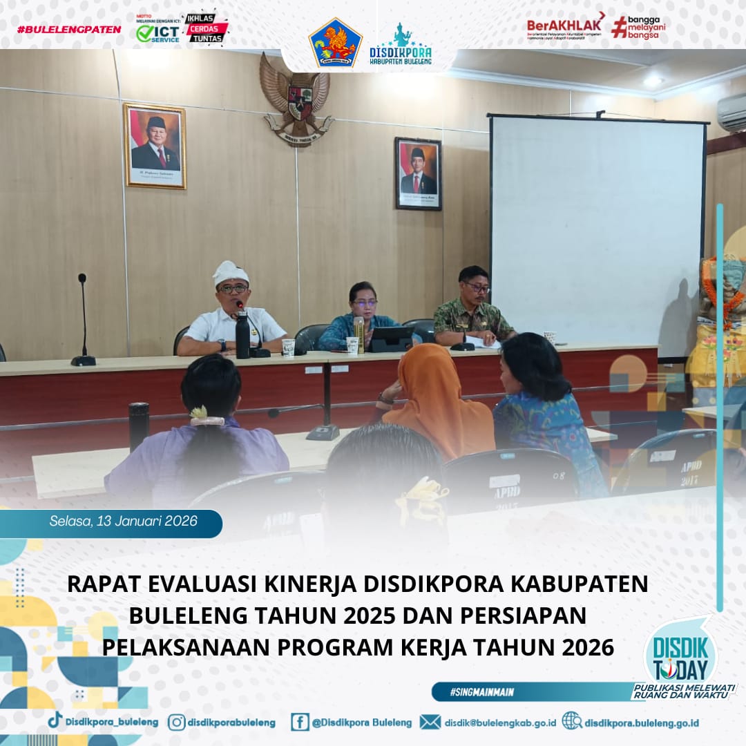 Dinas Pendidikan Pemuda dan Olahraga (Disdikpora) Kabupaten Buleleng menyelenggarakan rapat evaluasi kinerja tahun 2025 sekaligus persiapan pelaksanaan program kerja tahun 2026. Kegiatan yang dilaksanakan di Aula Disdikpora Kabupaten Buleleng ini diikuti oleh Koordinator Wilayah Kecamatan Disdikpora, K3S TK dan SD, serta MKKS tingkat kabupaten dan kecamatan se-Kabupaten Buleleng. Hadir pula para Kepala Bidang, Kepala Seksi, serta Jabatan Fungsional penyetaraan urusan pendidikan di lingkungan Disdikpora Kabupaten Buleleng.