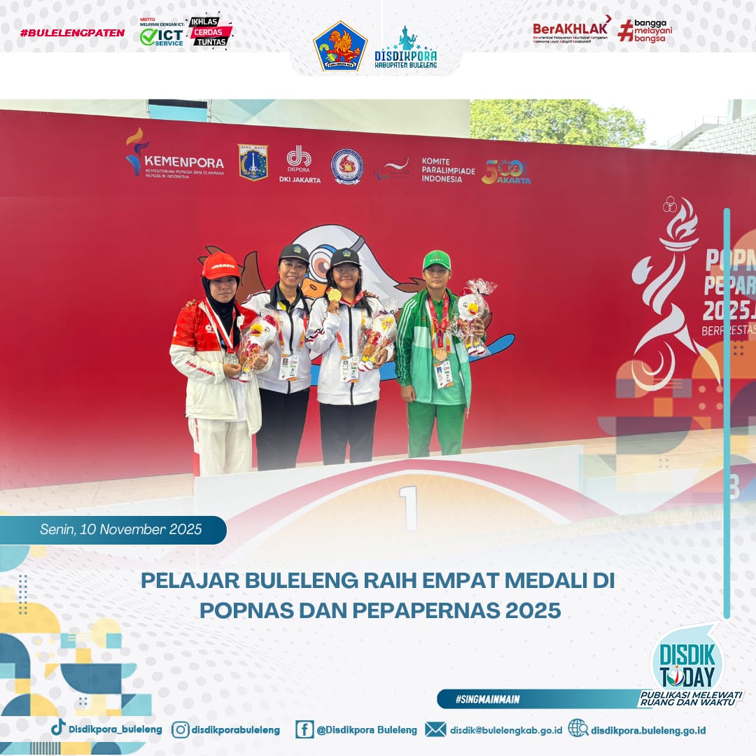 Kontingen pelajar Kabupaten Buleleng berhasil menunjukkan taringnya di kancah olahraga nasional dengan menyumbangkan total empat medali bagi Provinsi Bali dalam ajang Pekan Olahraga Pelajar Nasional (POPNAS) dan Pekan Paralimpik Pelajar Nasional (PEPAPERNAS) 2025 yang baru saja berakhir di Jakarta. Keberhasilan ini menjadi catatan positif bagi pembinaan atlet pelajar di Buleleng.