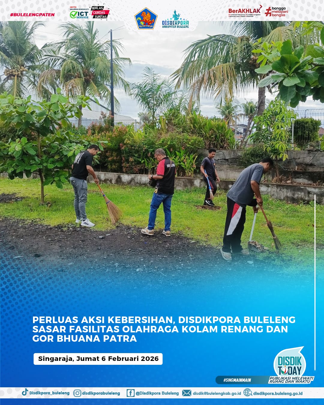 Komitmen Pemerintah Kabupaten Buleleng dalam menjaga kebersihan lingkungan tidak hanya berfokus pada kawasan pesisir. Setelah gencar melakukan aksi bersih-bersih di Pantai Pelabuhan Buleleng, Dinas Pendidikan Pemuda dan Olahraga (Disdikpora) Kabupaten Buleleng kini memperluas jangkauan sasarannya ke sejumlah fasilitas olahraga utama di wilayah perkotaan.