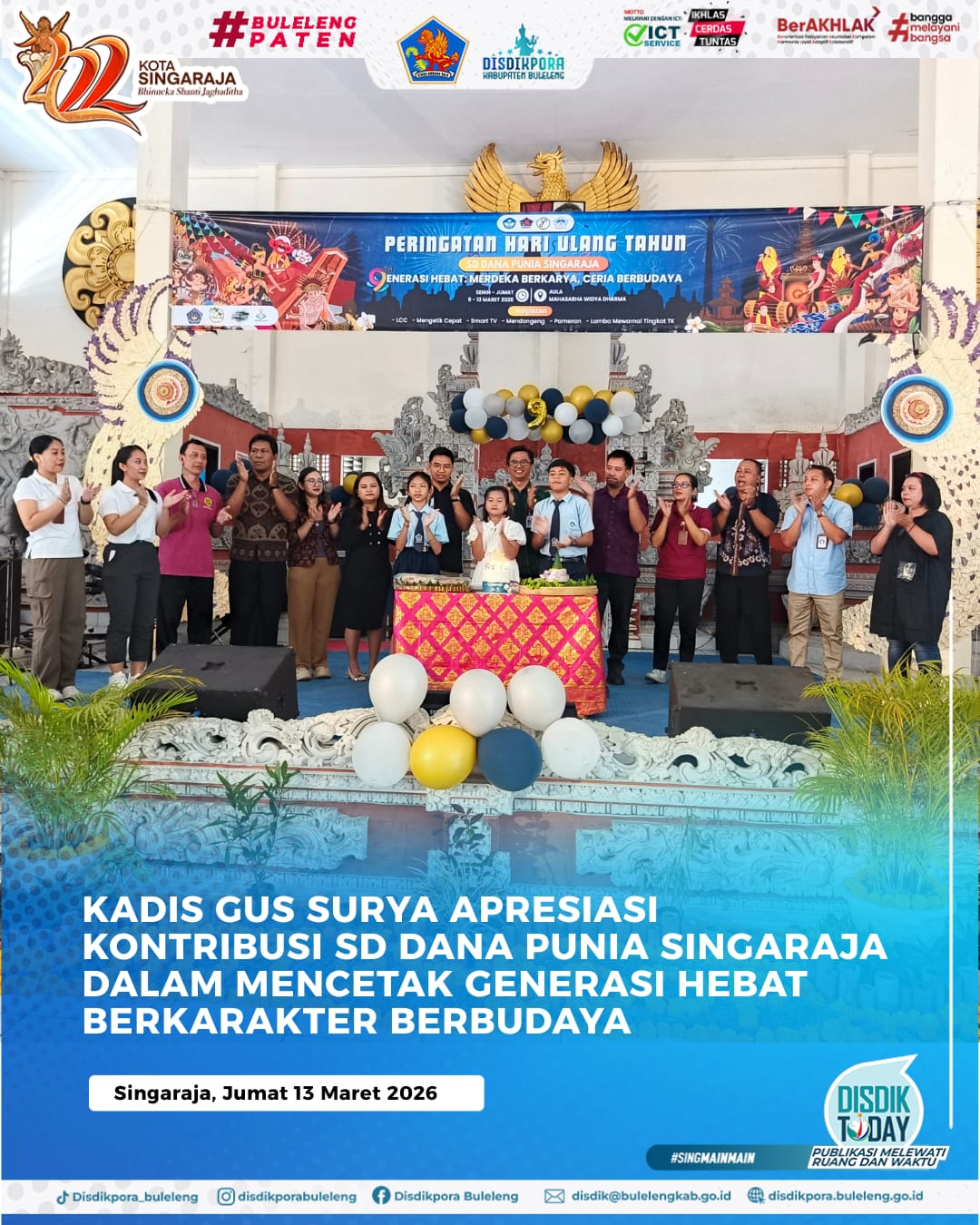 Kepala Dinas Pendidikan Pemuda dan Olahraga (Disdikpora) Kabupaten Buleleng, Ida Bagus Gde Surya Bharata, S.Pd., M.A.P., menghadiri perayaan Hari Ulang Tahun (HUT) ke-9 SD Dana Punia Singaraja, Jumat (13/3) pagi. Kehadiran Kadis Gus Surya didampingi oleh Kasi Kuserdik SD, I Ketut Agus Susilawan, S.Pd., M.Pd.