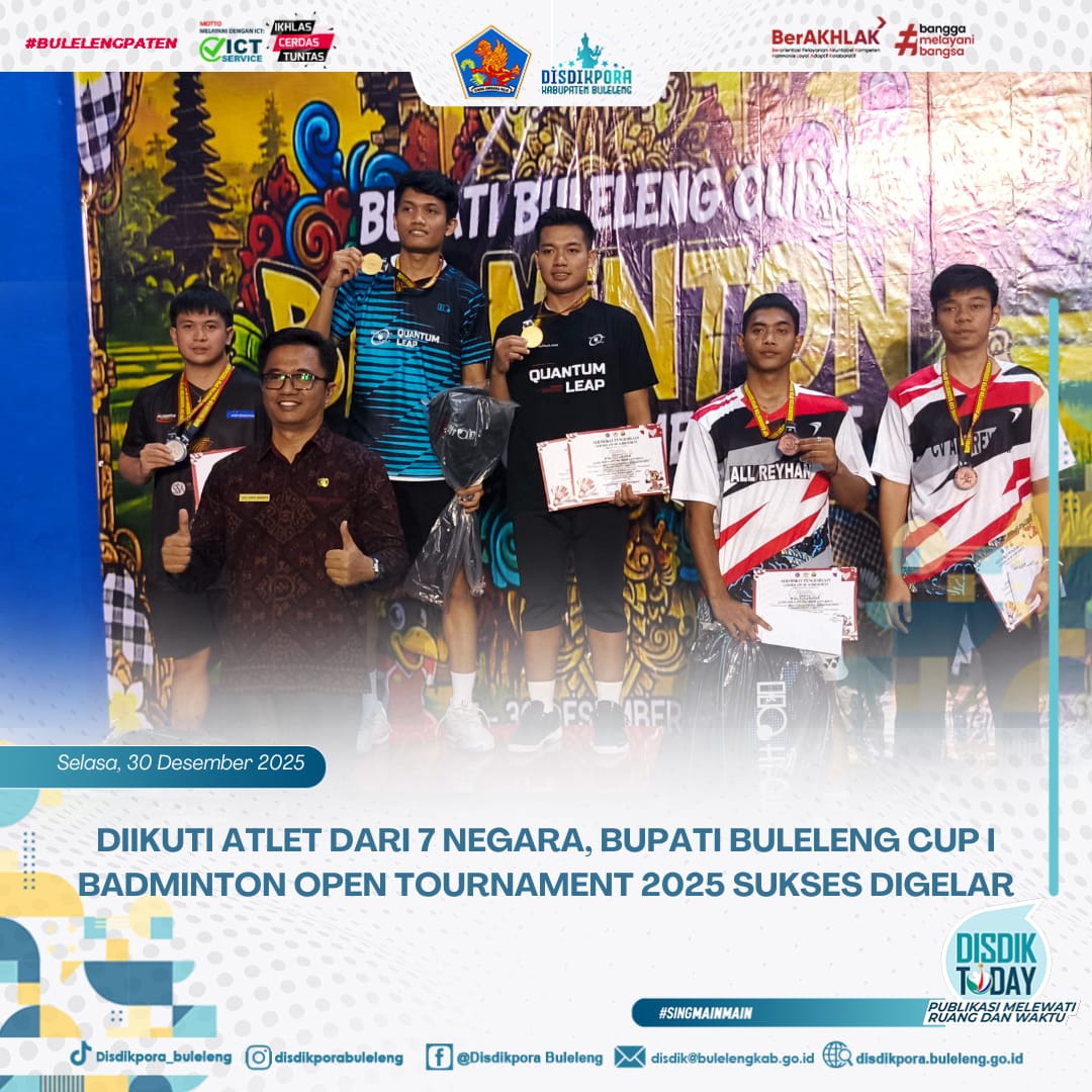 Turnamen bulutangkis bergengsi bertajuk Bupati Buleleng Cup I Badminton Open Tournament 2025 resmi berakhir. Mewakili Bupati Buleleng, Kepala Dinas Pendidikan Pemuda dan Olahraga (Disdikpora) Kabupaten Buleleng, Ida Bagus Gde Surya Bharata, S.Pd., M.A.P., menutup secara resmi gelaran tersebut di GOR Bulutangkis Undiksha Singaraja, Selasa (30/12).