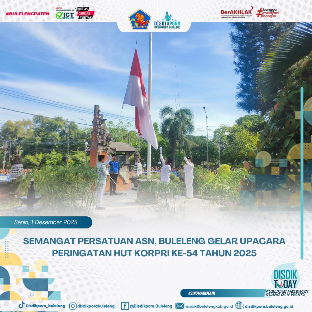 Korps Pegawai Republik Indonesia (KORPRI) Kabupaten Buleleng menggelar Upacara Peringatan Hari Ulang Tahun (HUT) Ke-54 Tahun 2025. Upacara yang berlangsung khidmat di Halaman Kantor Bupati Buleleng pada Senin (1/12) ini mengusung tema, “Bersatu, Berdaulat, Bersama KORPRI, Dalam Mewujudkan Indonesia Maju”.