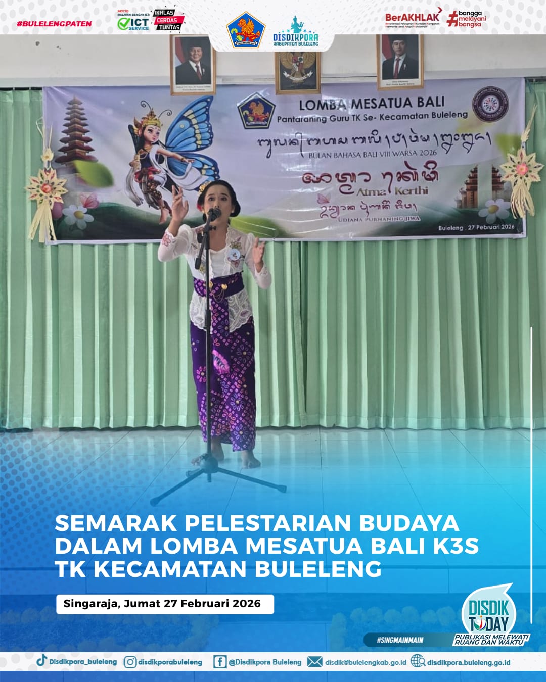 Dalam rangka memperingati Bulan Bahasa Bali, Kelompok Kerja Kepala Sekolah (K3S) TK Kecamatan Buleleng menyelenggarakan Lomba Mesatua Bali pada Jumat, 27 Februari 2026, bertempat di Aula Korwil Kecamatan Buleleng. Kegiatan ini berlangsung dengan penuh semangat, makna, dan komitmen bersama untuk menjaga warisan budaya Bali melalui dunia pendidikan anak usia dini.