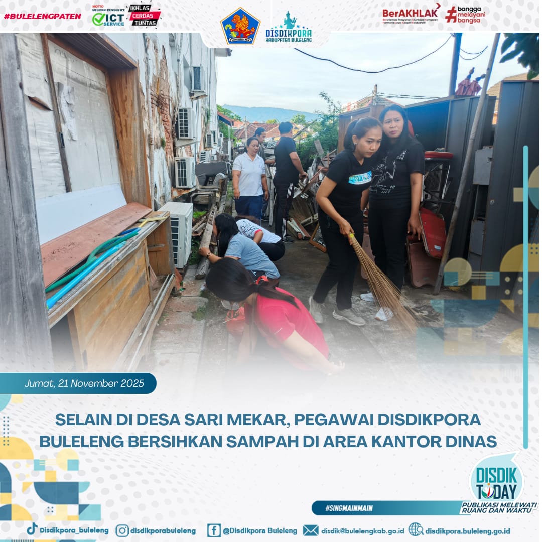 Selain aksi "Buleleng Bersih Sampah" di Desa Sari Mekar, Kecamatan Buleleng, pada hari Jumat (21/11), Dinas Pendidikan Pemuda dan Olahraga (Disdikpora) Kabupaten Buleleng juga melakukan gerakan kebersihannya di area internal mereka sendiri.