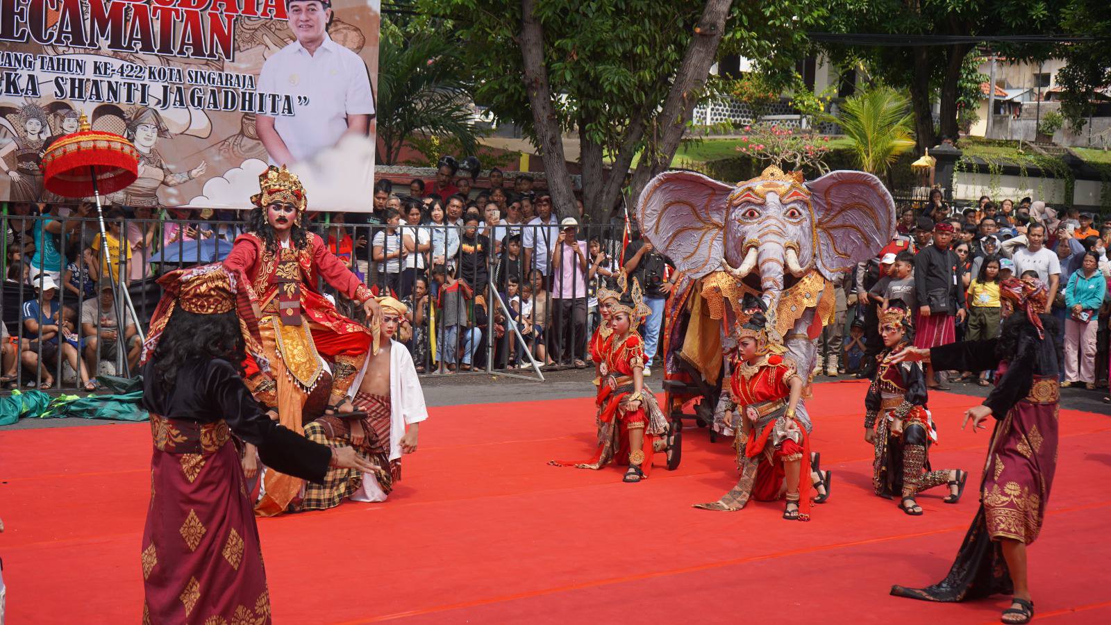 Salah satu suguhan utama yang mencuri perhatian adalah penampilan Fragmen Tari Sejarah Ki Barak Panji Sakti. Peserta dari masing-masing kecamatan tampil memukau tepat di depan Air Mancur Taman Kota Singaraja, membawakan lakon heroik sang pendiri kerajaan Buleleng tersebut.
