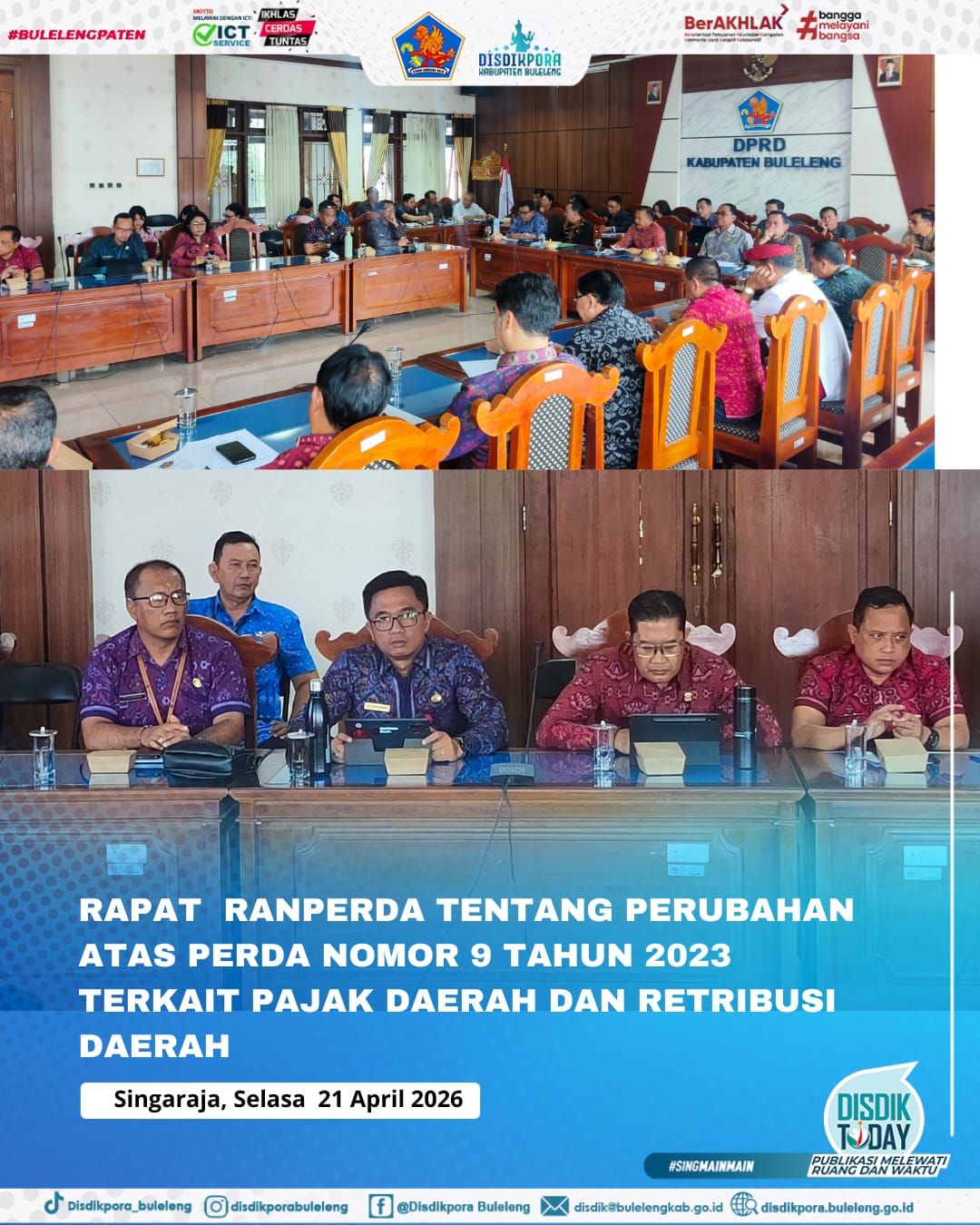 Kepala Dinas Pendidikan Pemuda dan Olahraga Kabupaten Buleleng Ida Bagus Gde surya Bharata, S.Pd., M.A.P., mengikuti Rapat Rancangan Peraturan Daerah (Ranperda) tentang Perubahan Atas Perda Nomor 9 Tahun 2023 terkait Pajak Daerah dan Retribusi Daerah bertempat di ruang Gabungan Komisi DPRD Buleleng pada Selasa (21/4).