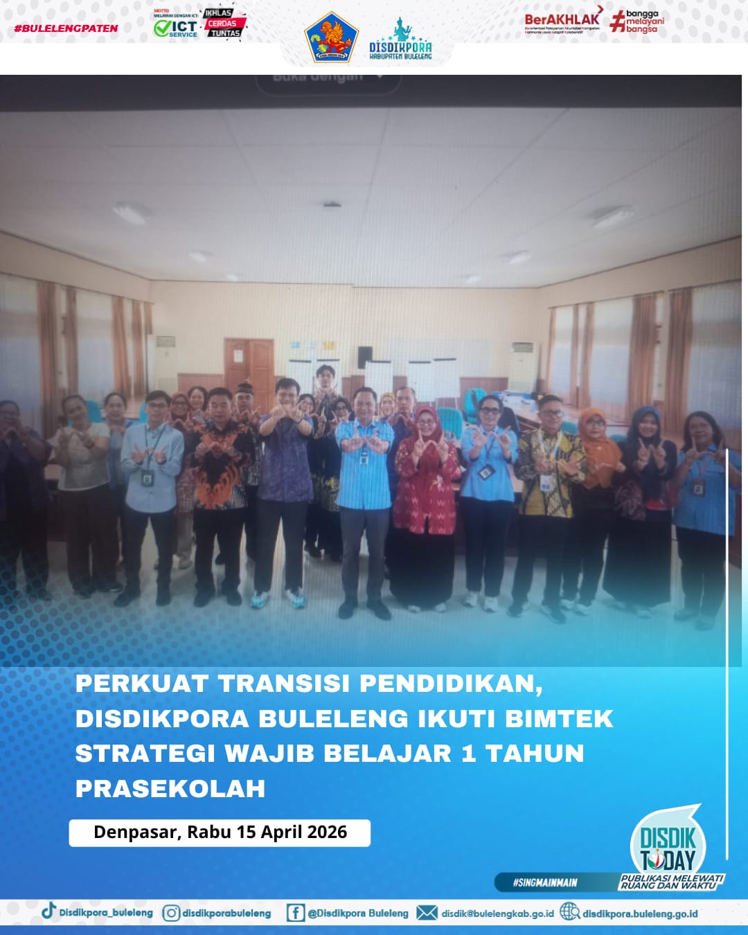Dinas Pendidikan Pemuda dan Olahraga (Disdikpora) Kabupaten Buleleng menegaskan komitmennya dalam memperkuat fondasi pendidikan anak usia dini. Hal ini ditunjukkan dengan kehadiran perwakilan Disdikpora Buleleng dalam kegiatan Bimbingan Teknis (Bimtek) Penguatan Substansi dan Strategi Wajib Belajar 1 Tahun Prasekolah, yang berlangsung di Balai Penjaminan Mutu Pendidikan (BPMP) Provinsi Bali pada 13–15 April 2026.