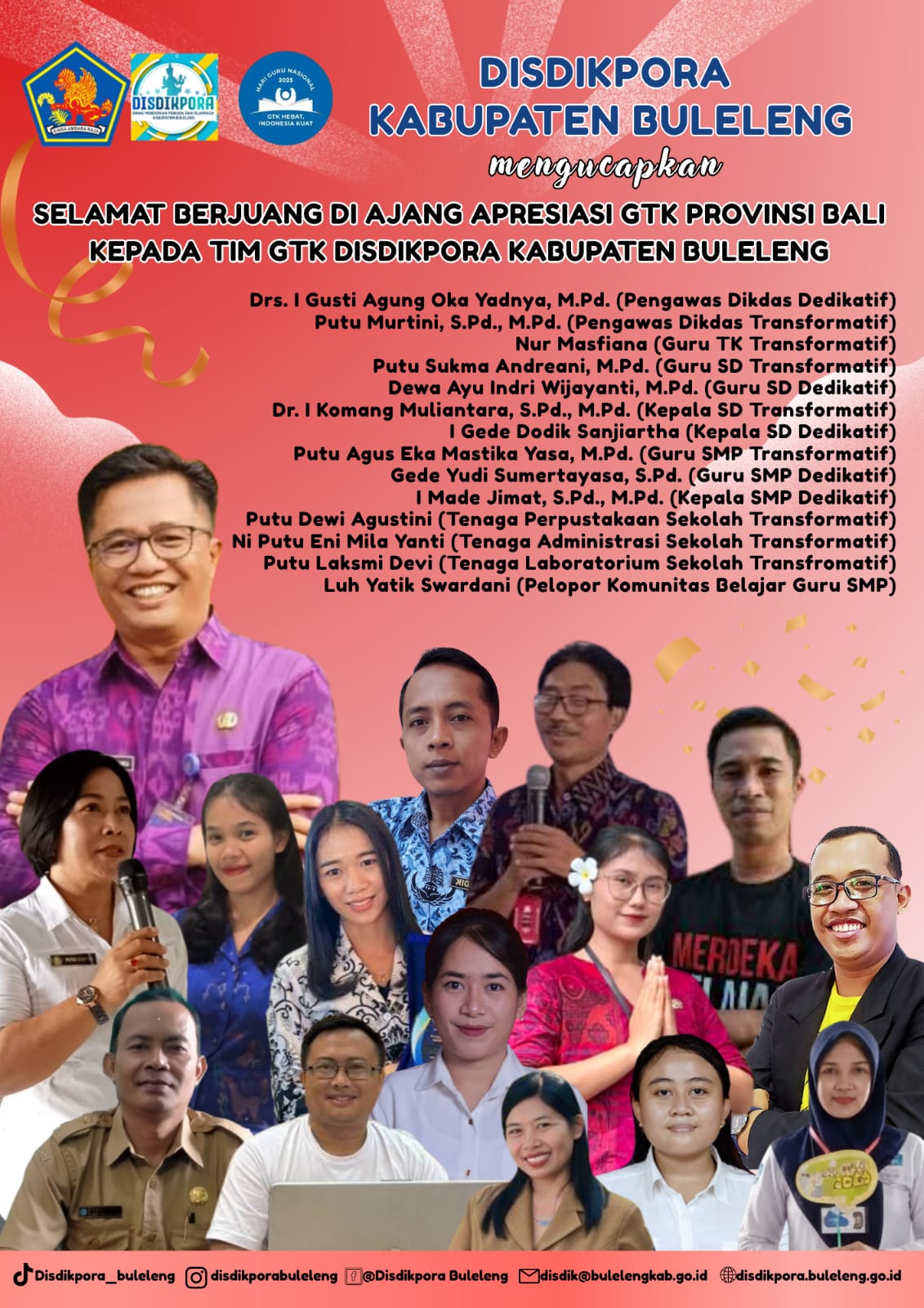 Kesuksesan mereka diharapkan tidak hanya membawa nama baik Buleleng, tetapi juga dapat terus menginspirasi dan memotivasi rekan-rekan Pendidik dan Tenaga Kependidikan lainnya, serta berkontribusi nyata dalam memajukan kualitas pendidikan secara khusus di Kabupaten Buleleng.