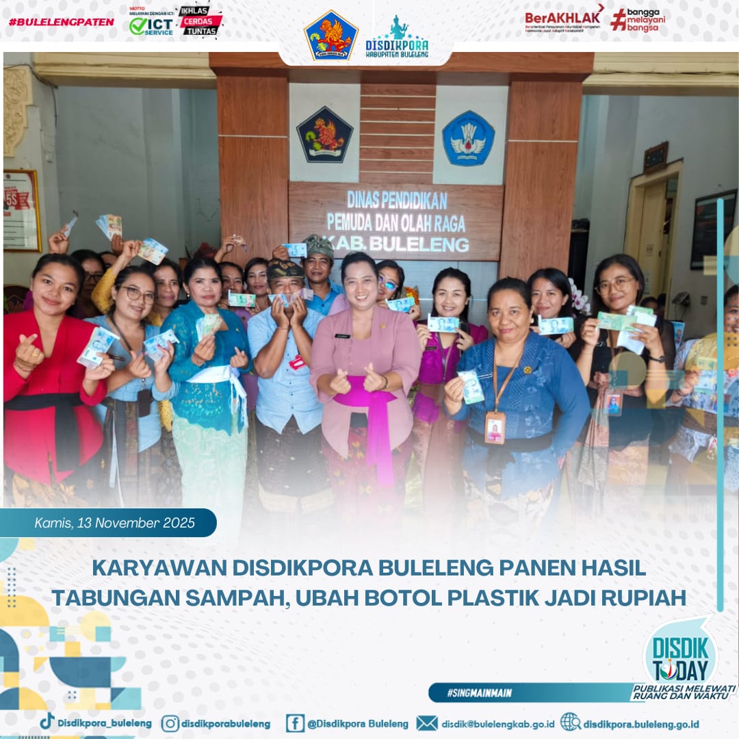 Komitmen terhadap kebersihan lingkungan sekaligus semangat menabung diperlihatkan secara nyata oleh karyawan dan karyawati di lingkungan Dinas Pendidikan Pemuda dan Olahraga (Disdikpora) Kabupaten Buleleng. Setelah rutin menyetorkan sampah anorganik ke "Bank Sampah" internal, para pegawai kini memetik hasilnya dalam bentuk uang tunai yang dicairkan dari buku tabungan sampah mereka.