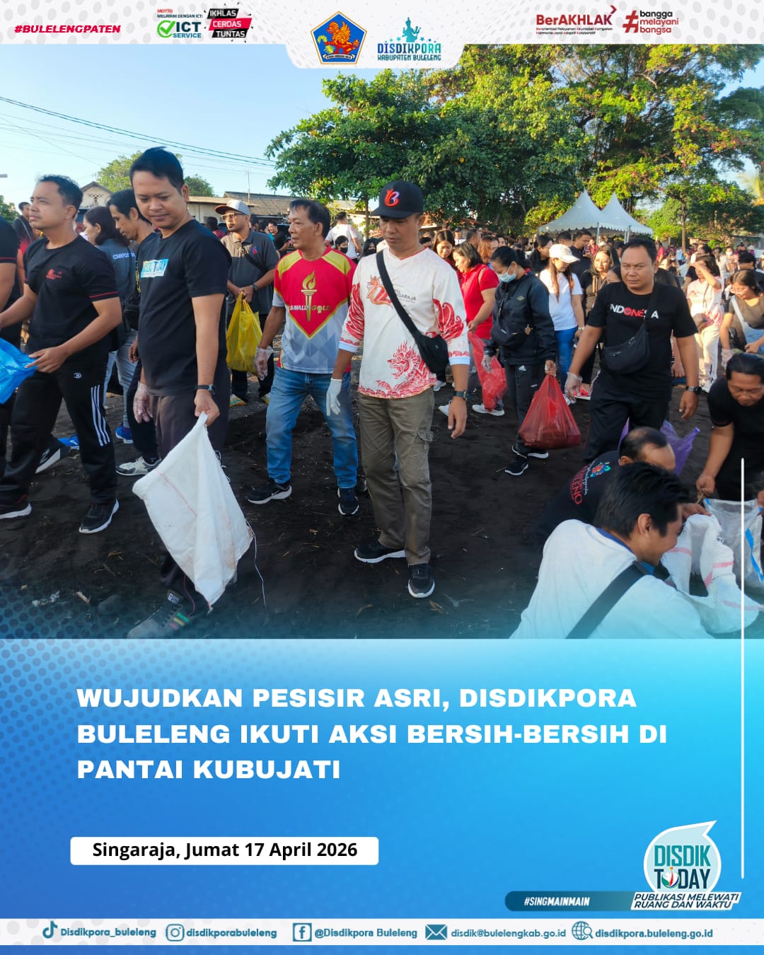 Sebagai wujud nyata kepedulian terhadap kelestarian lingkungan dan implementasi pola hidup bersih, jajaran Dinas Pendidikan Pemuda dan Olahraga (Disdikpora) Kabupaten Buleleng terjun langsung melaksanakan aksi bersih-bersih pantai pada Jumat pagi (17/4).