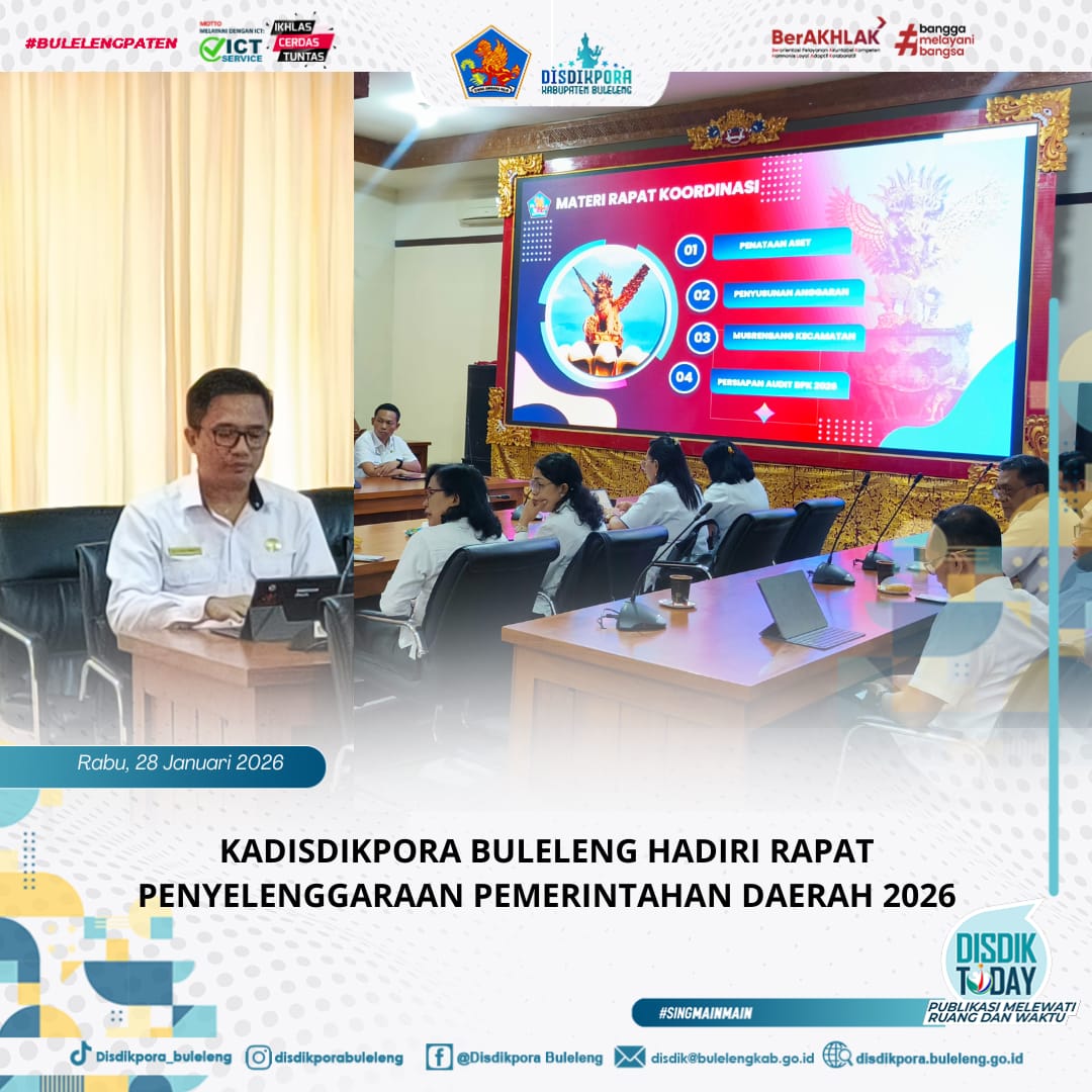 Kepala Dinas Pendidikan Pemuda dan Olahraga Kabupaten Buleleng Ida Bagus Gde Surya Bharata, S. Pd., M. A. P., mengikuti rapat koordinasi penyelenggaraan Pemerintahan Daerah tahun 2026 bertempat di Rumah Jabatan Bupati Buleleng, Rabu (28/1).