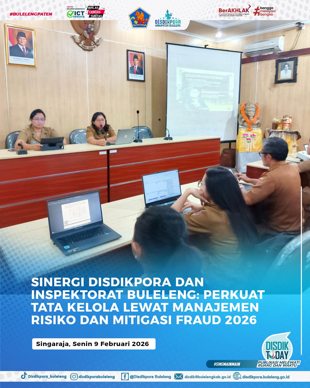 Dalam upaya mewujudkan tata kelola pemerintahan yang bersih, transparan, dan akuntabel, Dinas Pendidikan, Pemuda, dan Olahraga (Disdikpora) Kabupaten Buleleng menggelar kegiatan Penyempurnaan Penyusunan Manajemen Risiko (MR) dan Mitigasi Fraud untuk Tahun Anggaran 2026. Kegiatan yang berlangsung di Aula Disdikpora Buleleng ini menghadirkan Inspektorat Kabupaten Buleleng sebagai narasumber utama untuk memberikan penguatan teknis.