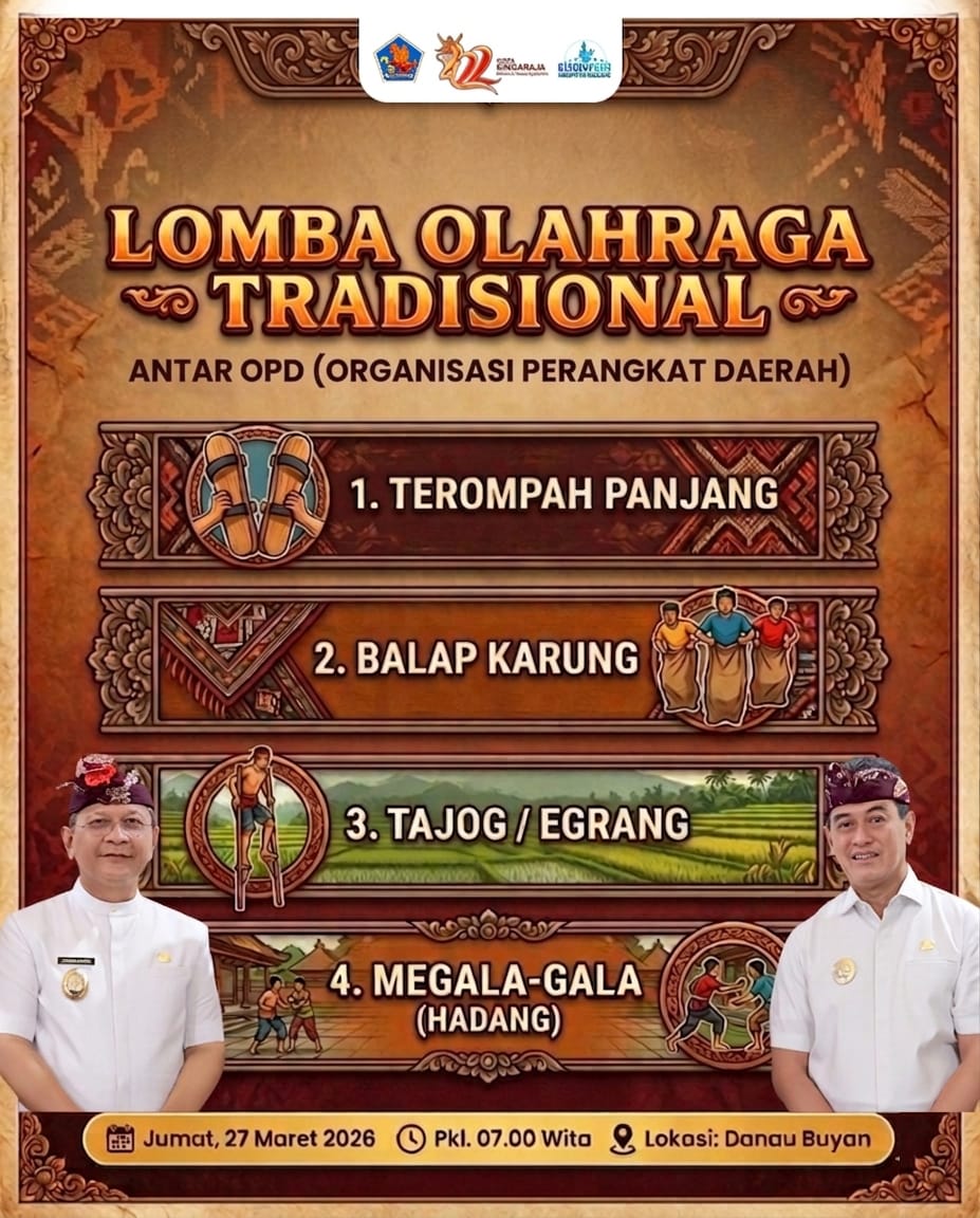 "Dalam rangka merayakan HUT Kota Singaraja ke-422, mari saksikan Lomba Olahraga Tradisional antar OPD.